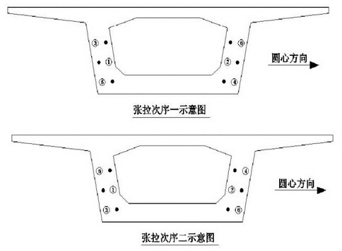 同截面張拉順序問題:先要根據(jù)施工方法相應(yīng)的受力要求確定。對于可同工況張拉的同類型鋼束(例如都是短束、或都是長束),應(yīng)遵循對稱,由內(nèi)向外的原則。例如先張拉腹板束,再張拉頂?shù)装?。其?shí)對于直線橋,截面張拉順序?qū)?yīng)力影響不大,可靈活調(diào)整。但是對于彎橋,研究證明,遵循對稱張拉的大前提下,宜先張拉外側(cè)腹板束,再張拉內(nèi)側(cè)腹板束。原因是外側(cè)鋼束會使曲率降低而內(nèi)側(cè)鋼束則會增大曲率,即“外側(cè)安內(nèi)側(cè)危險”。如下圖所示。